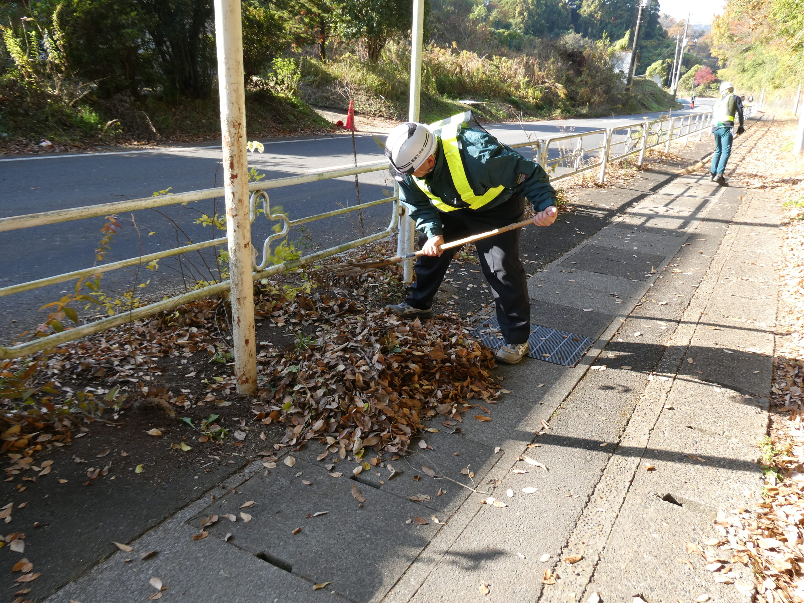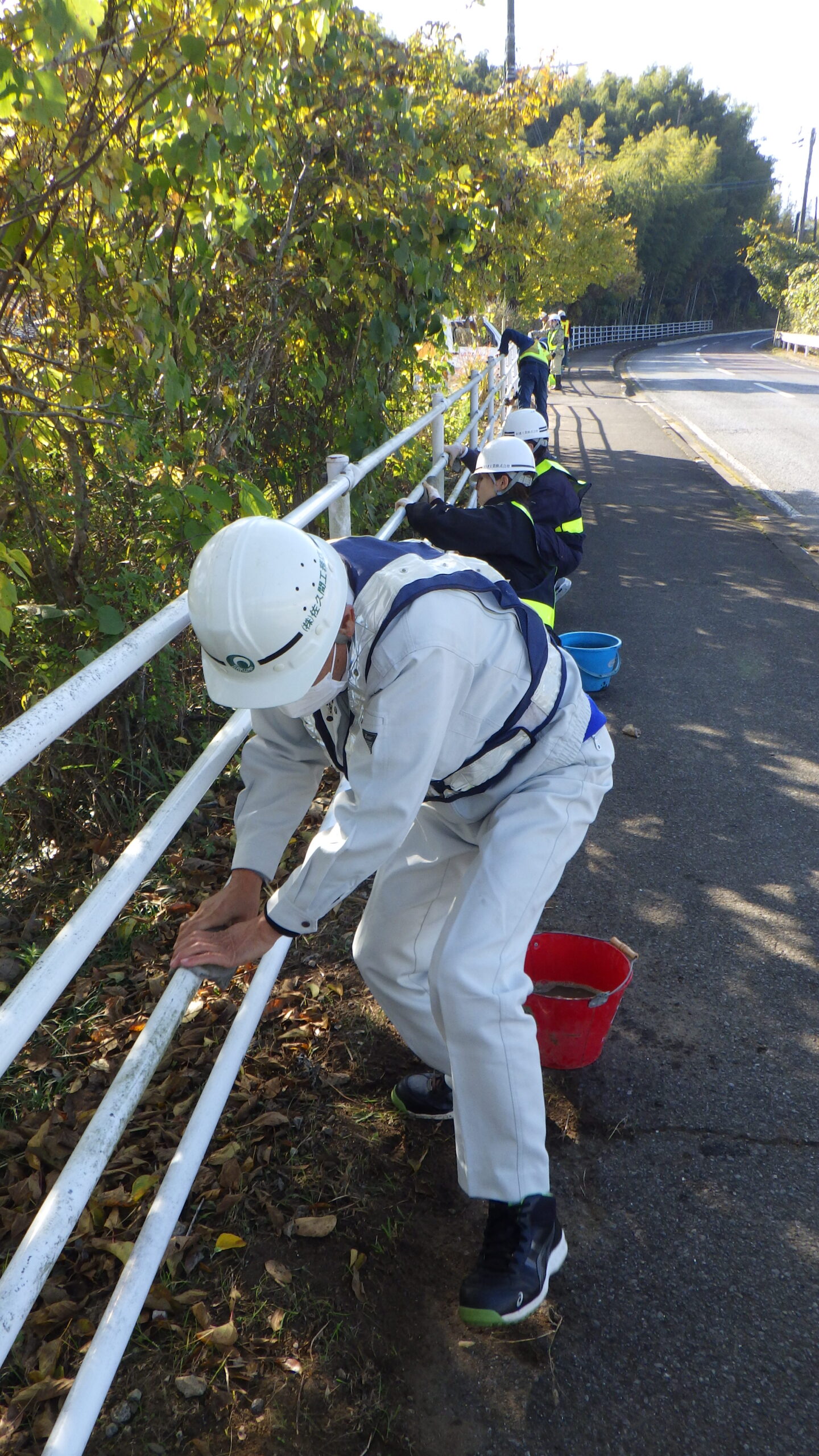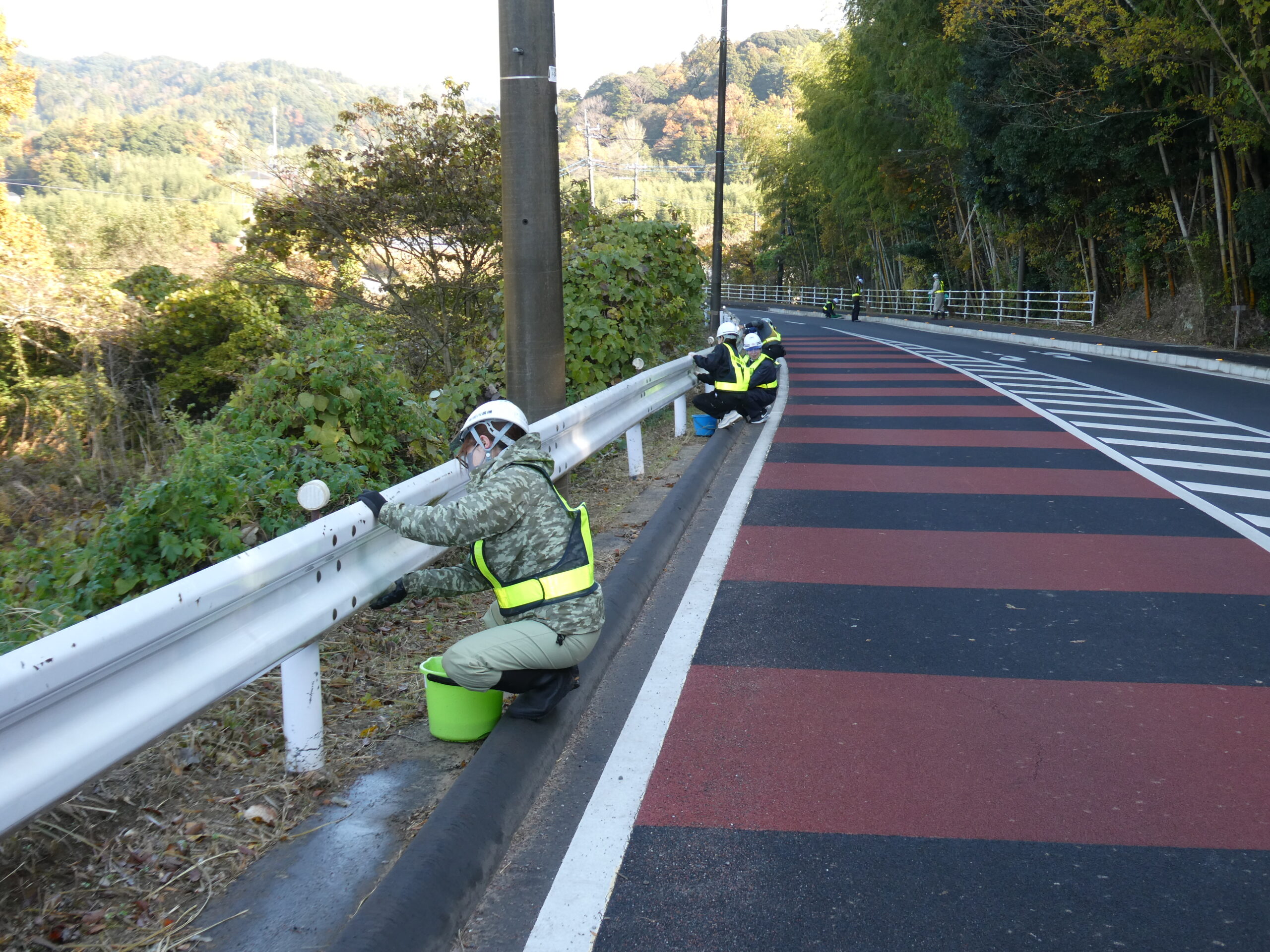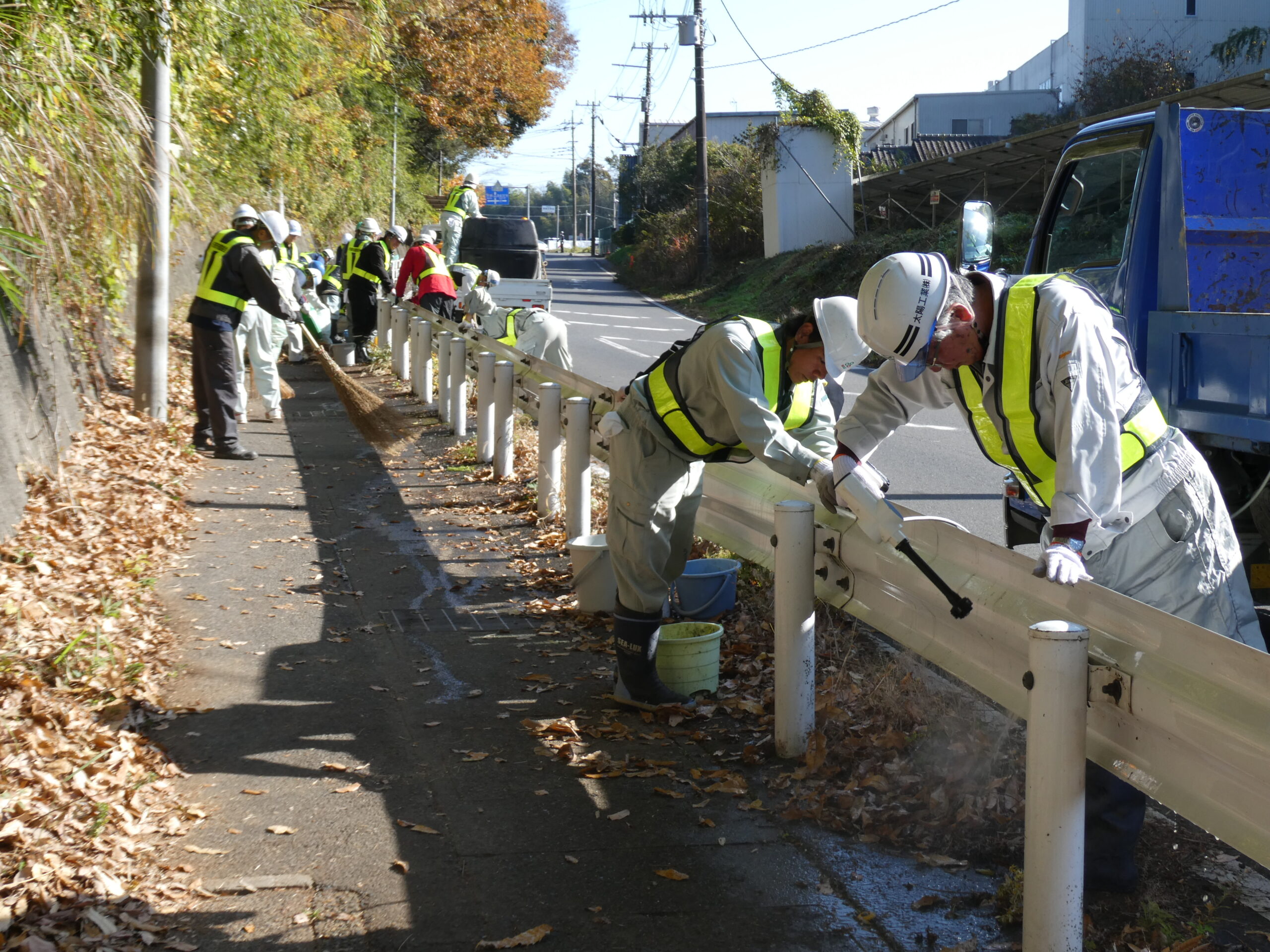 今回は市原市県道鶴舞牛久線~うぐいすライン(南総中学校付近)にて道路清掃を実施いたしました。 地域の方々や未来の担い手である学生に建設業への理解をより深めていただくため、地域社会貢献活動として落ち葉等の除草作業や道路の空き缶・ごみ拾い、ガードレール清掃を行いました。 当日は車道付近での作業となる為、周囲確認と相互の声がけを行い、安全作業にて行いました。